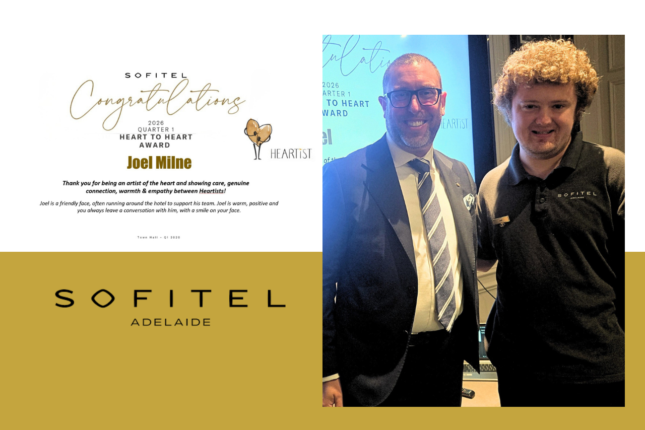 Joel was recently awarded Sofitel Adelaide’s Heart to Heart Award, one of three quarterly staff awards that recognise team members who go above and beyond for their colleagues. The Heart to Heart Award specifically honours staff who consistently display true care, positivity and teamwork, making a real difference to both guests and colleagues. Joel was chosen for this recognition for his strong commitment to supporting his team and for the personal connections he builds every day.